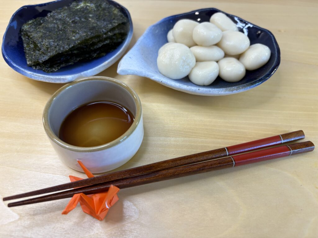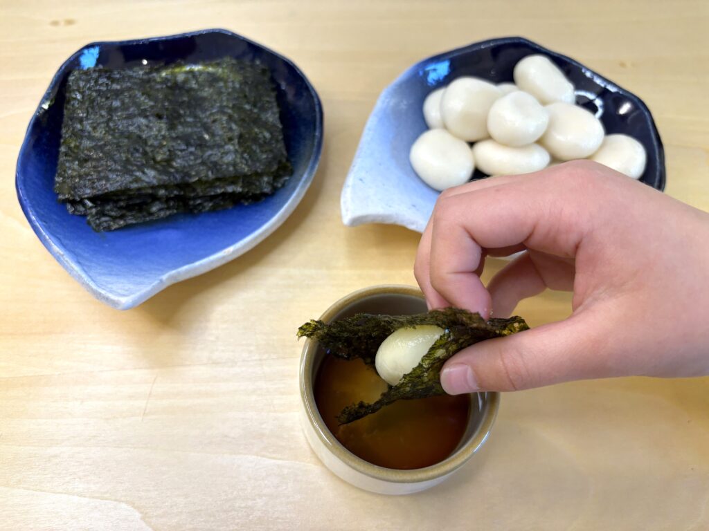 My favourite way to enjoy it is isobe-mochi — toasted mochi wrapped in nori (seaweed) and dipped in dashi soy sauce.